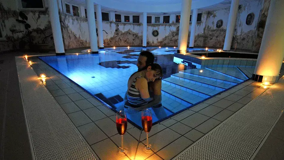 Mint a filmekben! A szálloda wellness része már bezárt és csak nektek van kulcsotok. Bementek, pukkanhat a pezsgő, koccintás és csobbanhattok.