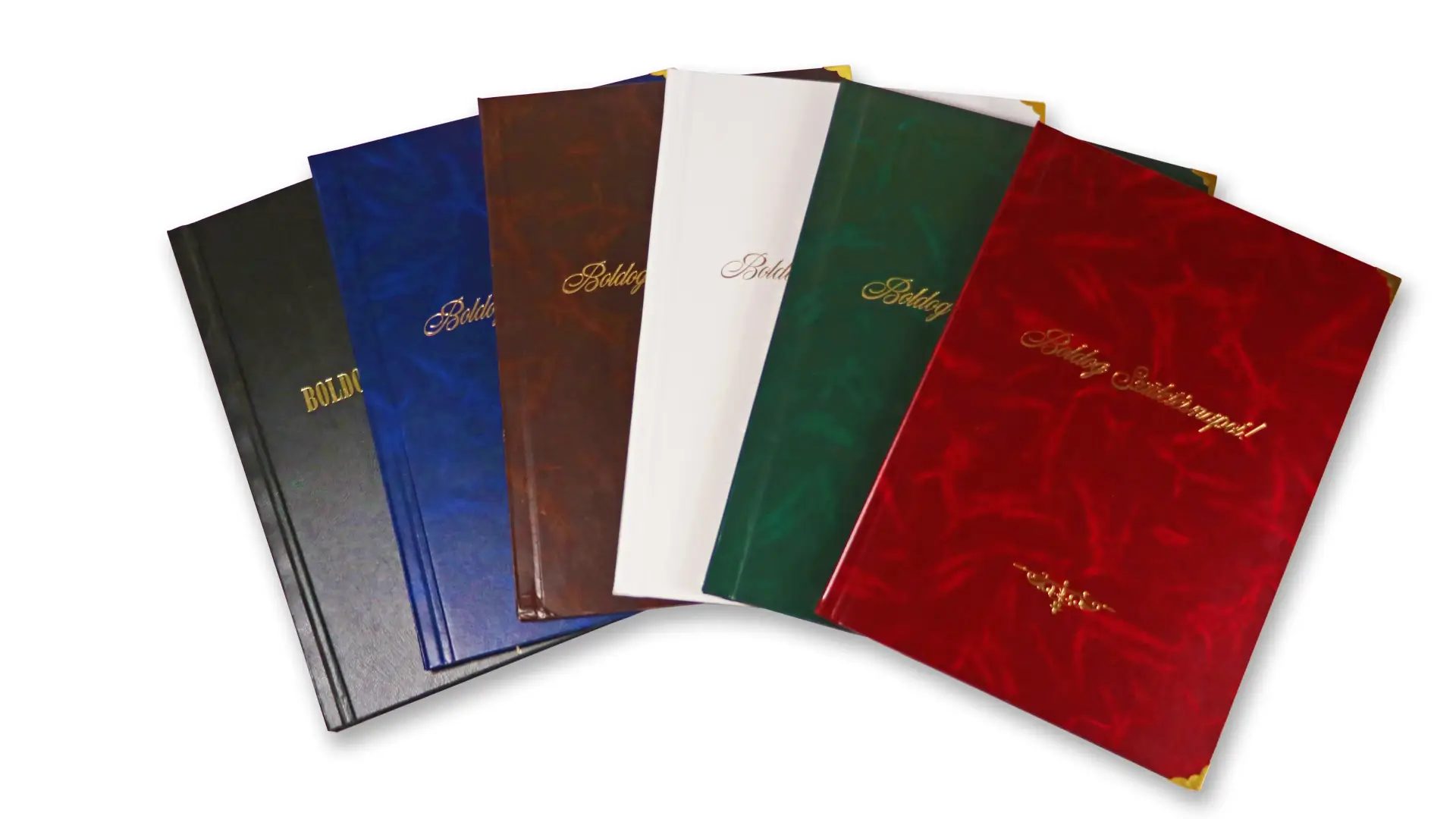 A borító színe választható: bordó, barna, fekete, fehér, kék és zöld.