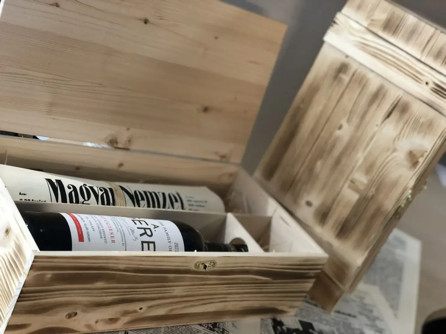 Születésnapi újság szép fadobozban ajándék üveg BORRAL