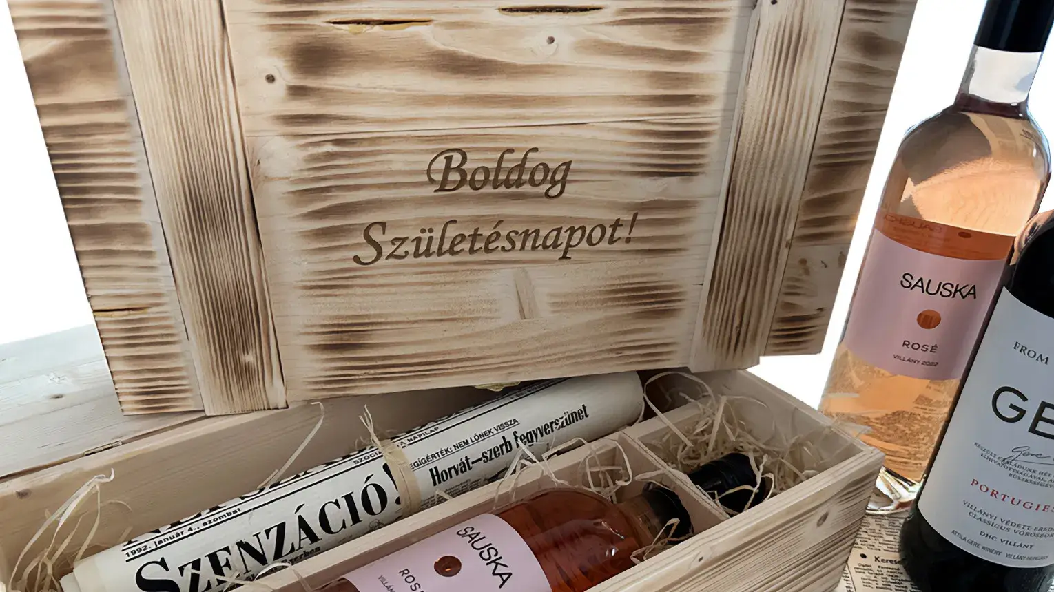 Legelegánsabb átadási forma amikor szép fadobozban egy üveg finom itallal pillantja meg az ünnepelt ezt a személyes ajándékot, ami az Ő születésnapjáról szól. Az aznapi jelentős híreket, érdekességeket tartalmazza.