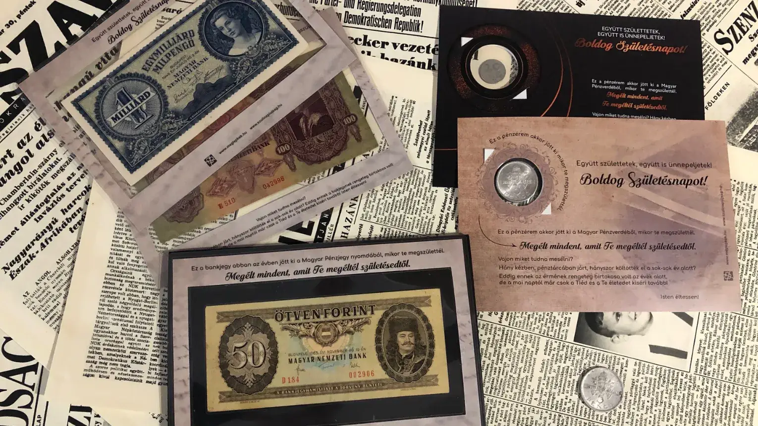 A születésnapi bankjegy megrendelésnél abban az évben megjelent pénzek közül választunk egy patinás darabot, lamináljuk egy kisérő lappal együtt. A lapot egy elegáns díszborítékban helyezzük el. Így már meg is van a kis figyelmesség, a kedves ajándék!