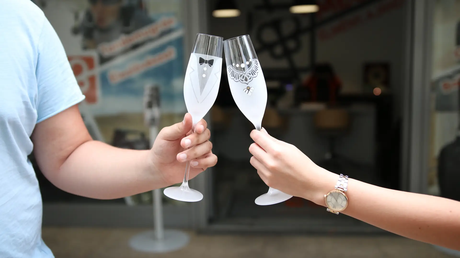 Egyedi Férfi-Nő pezsgőspohár nászajándékba, évfordulóra vicces designnal