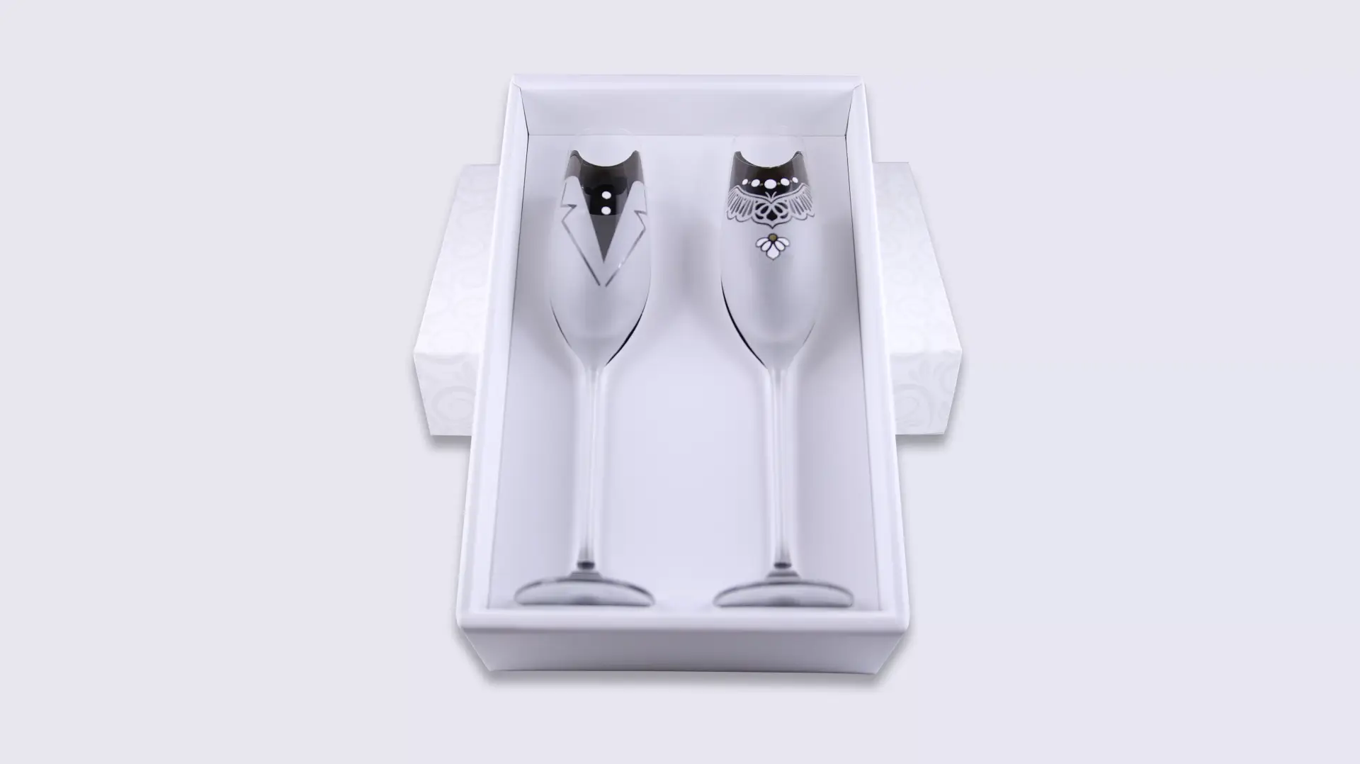 A design pezsgőspoharak magassága 26 cm. A képen látható díszdobozba csomagoljuk.