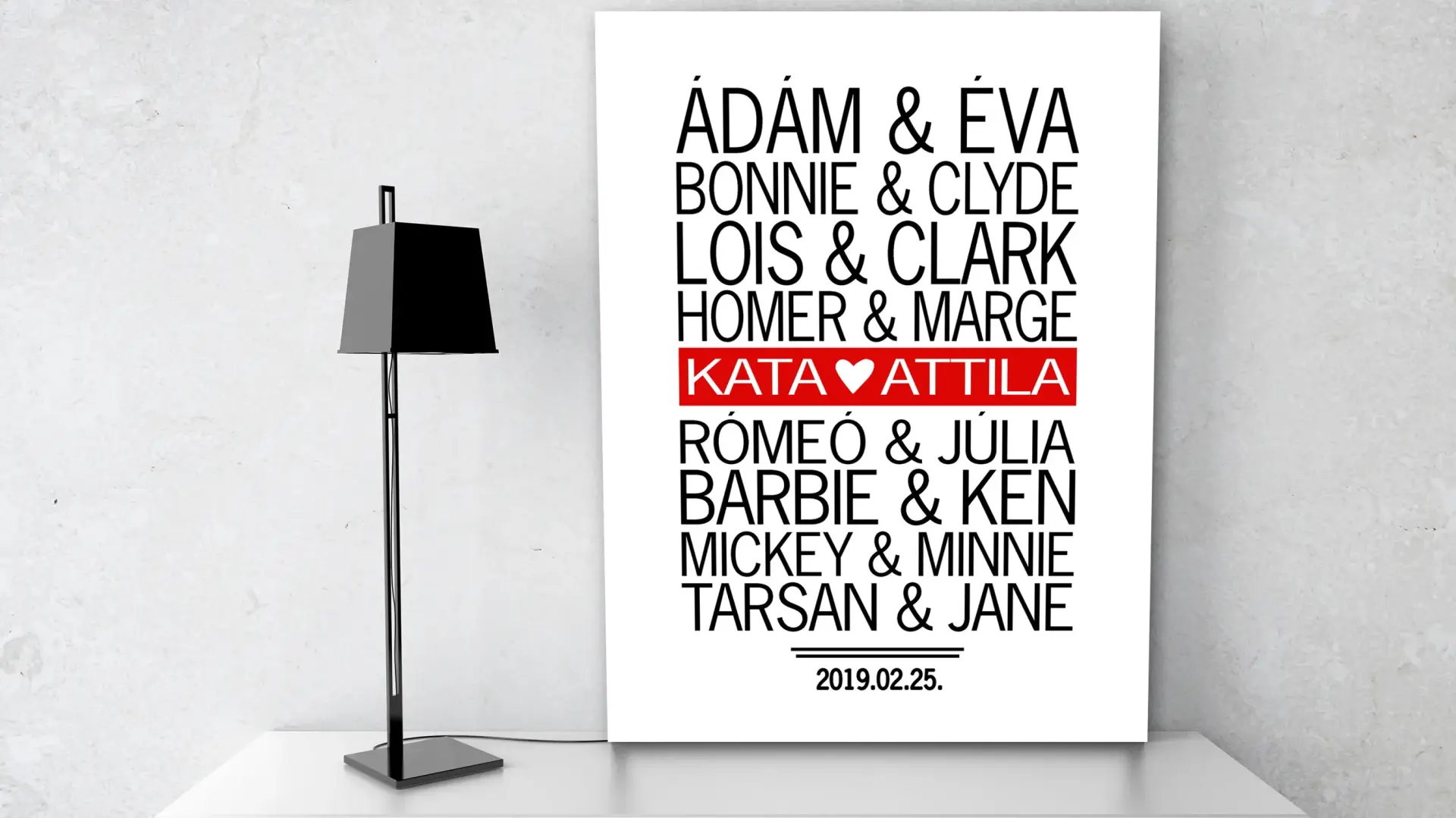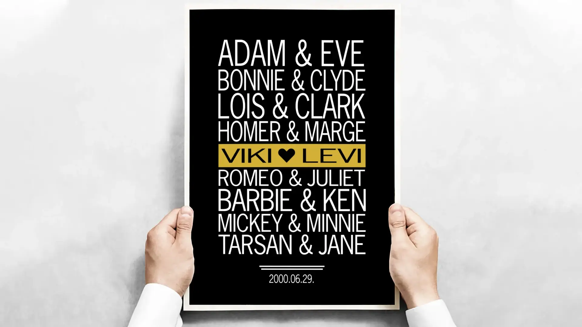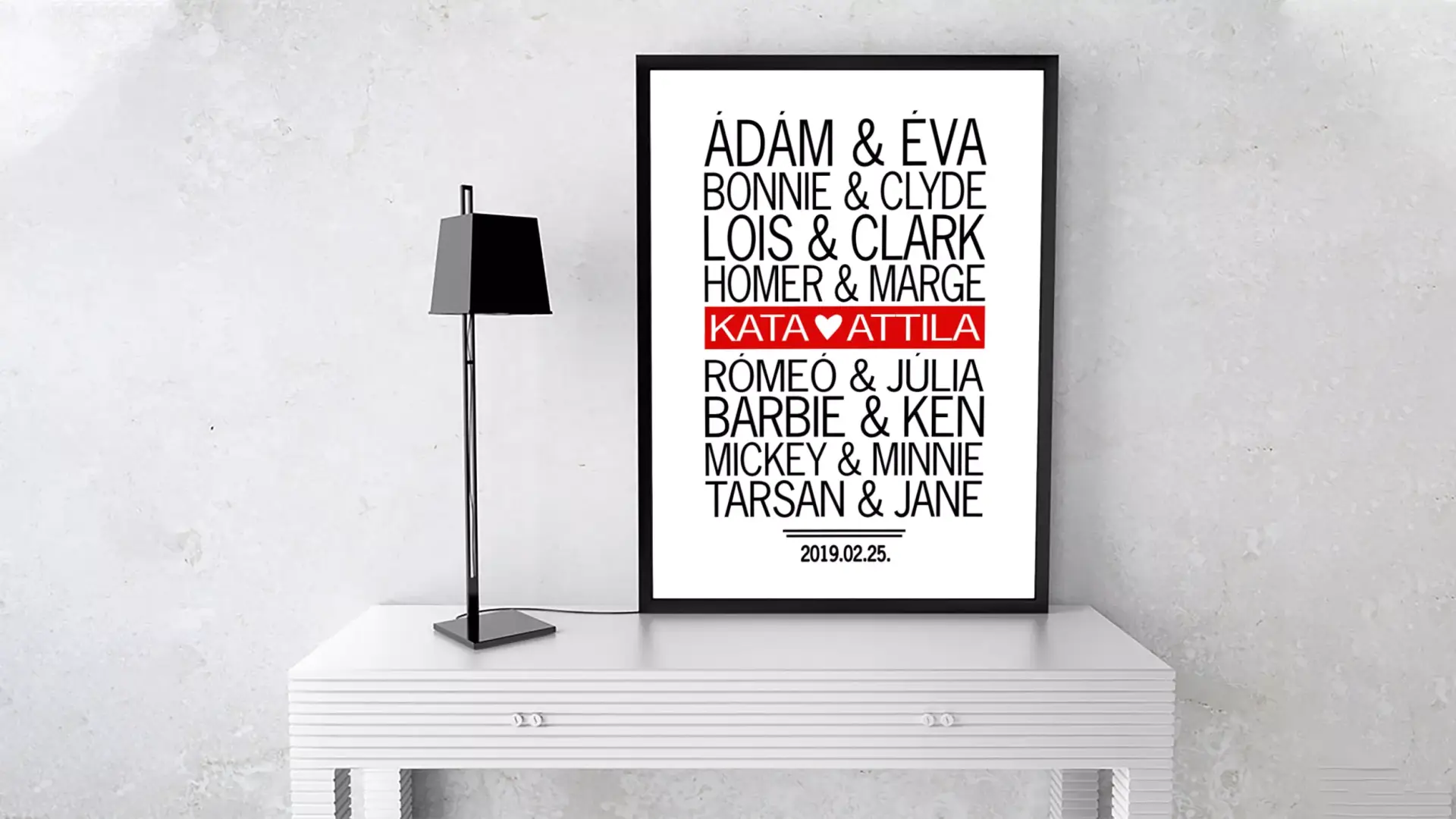 A Szerelmes nevek posztert kérheted fekete és fehér alapszínben is tetszésed szerint! A mérete A2-es és keretben kinyomtatva vagy pedig habkartonra nyomtatva adjuk át, vagy postázzuk neked!