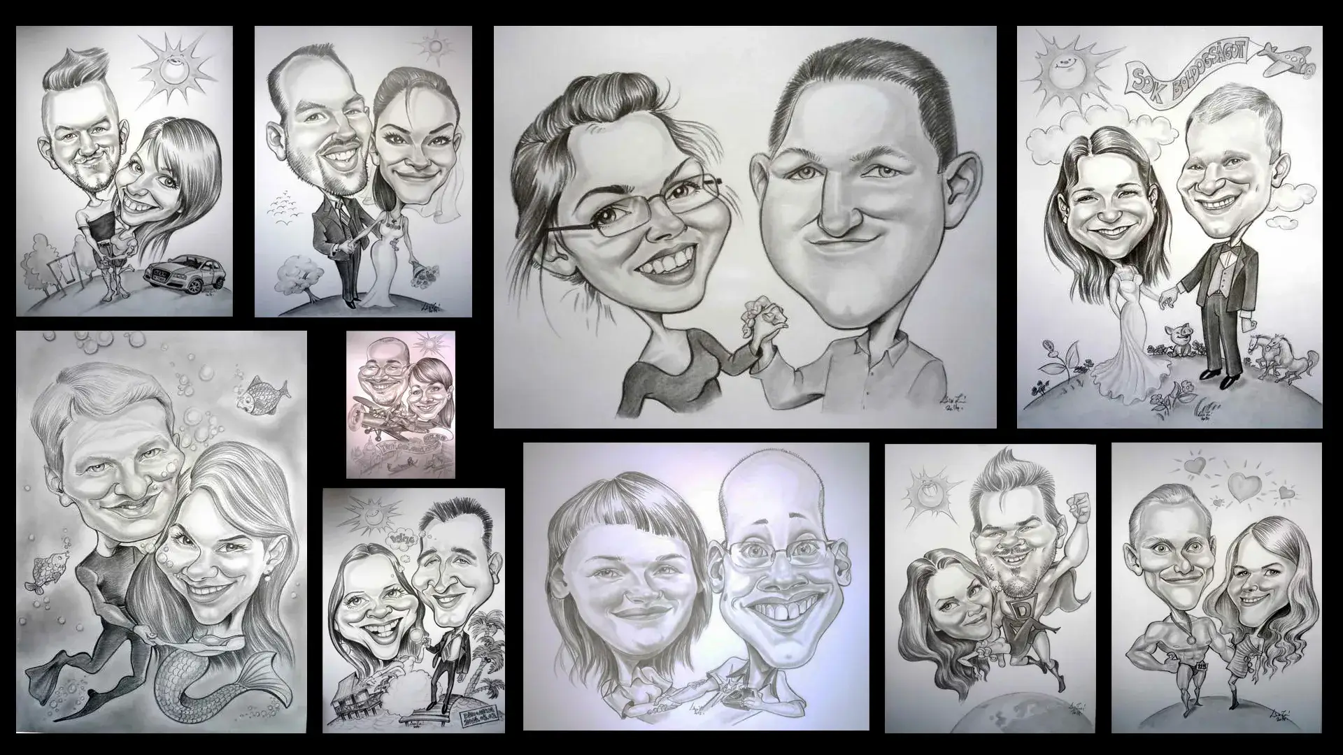 A karikatúrista művészet szabad teret enged a különböző kéréseknek. Az ünnepeltet különféle környezetbe, szituációba tudja helyezni a karikatúrista.